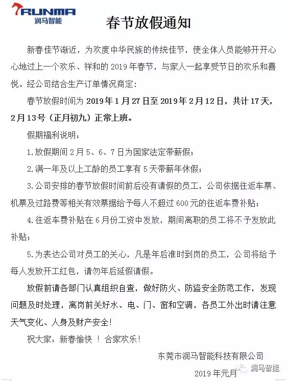 潤馬智能 春節(jié)放假通知: