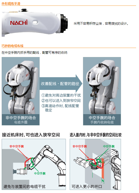 - 通過中空結(jié)構(gòu)的手腕*智能地對(duì)機(jī)械手電纜進(jìn)行配線。通過簡潔的穿插配線防止與周圍的裝置干擾,設(shè)備的可靠性大幅提高。緊湊,寬大的動(dòng)作范圍。